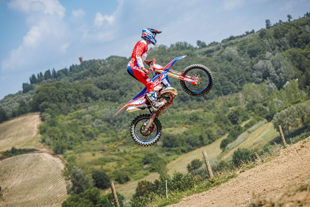 Features: Six speed transmission, plated exhaust pipe, adjustable power valve, 19" rear wheel, electric starter, billet aluminum footpegs, racing graphics & seat cover, custom power delivery for MX, & KYB front and rear MX suspension