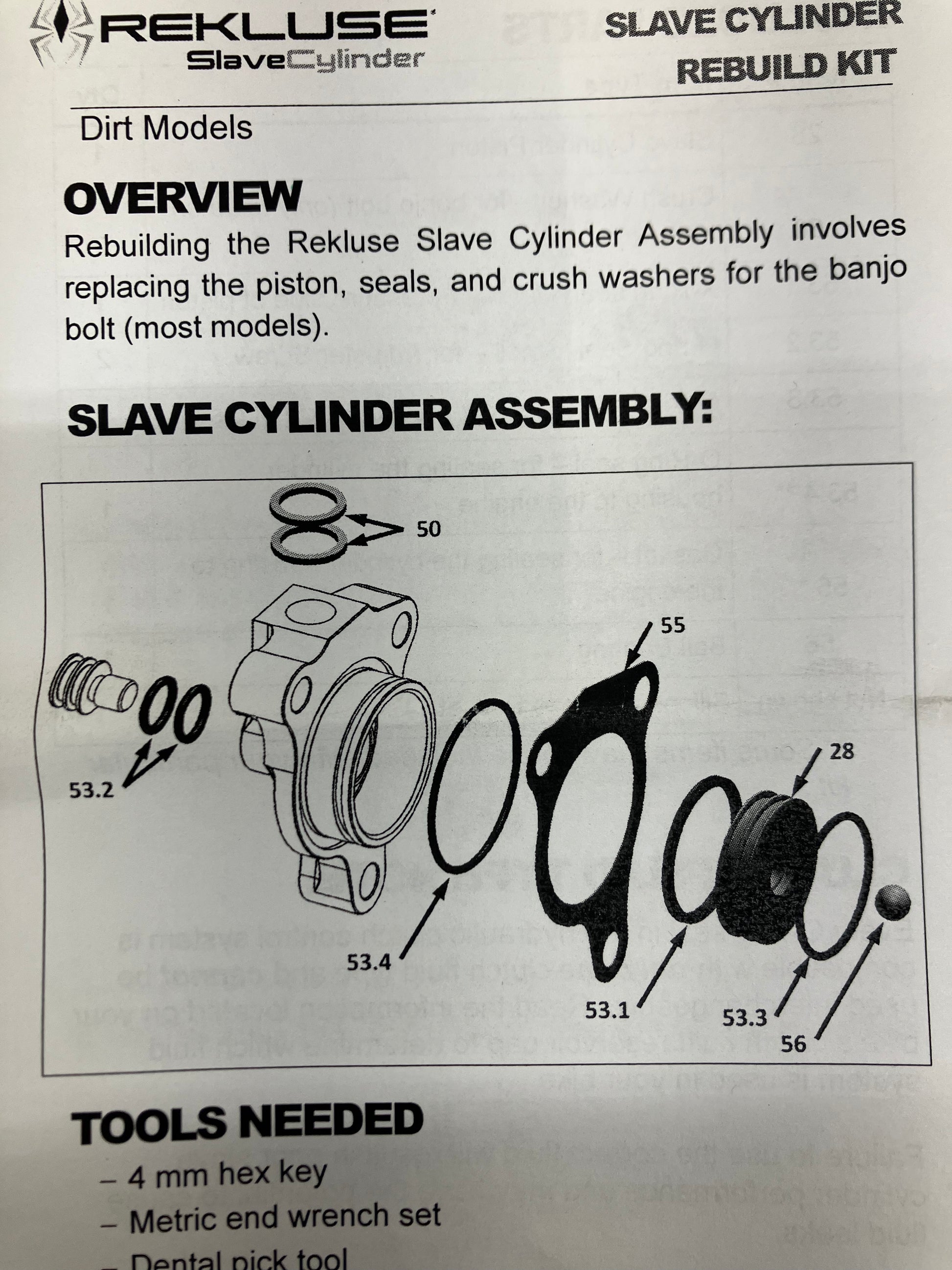 - Rekluse Rebuild Kit consist of materials and components to fix the clutch slave cylinder. Sold as a pack.